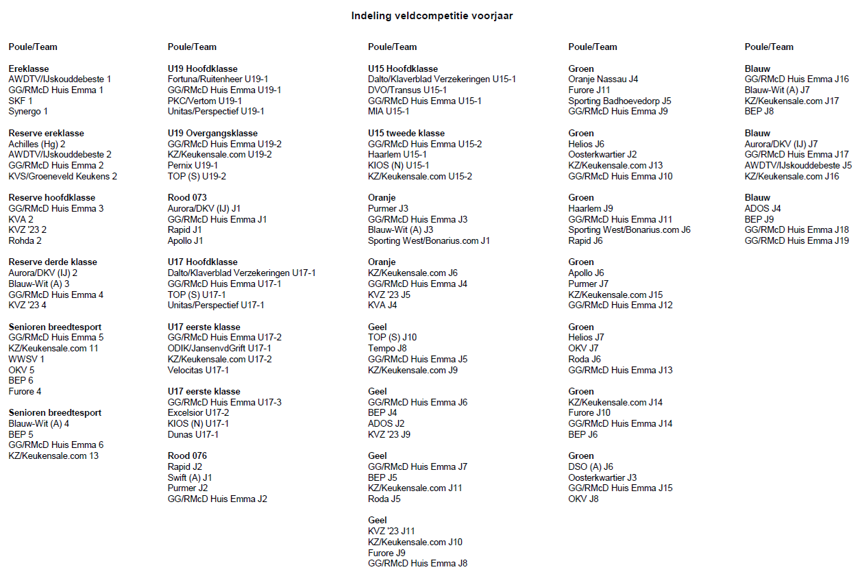 De indelingen voor het voorjaar zijn bekend gemaakt. Deze zijn terug te vinden in de wedstrijdapp van en op de website van het KNKV. Hieronder staan de indelingen voor de teams van Groen-Geel.