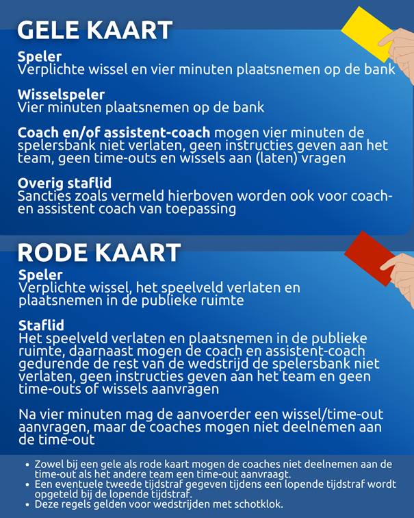 Afgelopen weekend is de zaalcompetitie gestart. Er zijn geen wijzigingen rondom gele kaarten en tijdstraffen in de regelgeving. Desondanks hebben ons signalen bereikt dat de toepassing afgelopen weekend niet goed is gegaan. In onderstaande visual leggen we het nogmaals uit. Deze visual kunnen jullie ook binnen jullie vereniging delen met iedereen die betrokken is bij wedstrijden met schotklok.