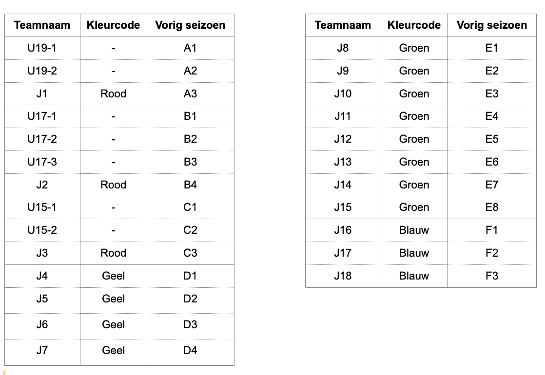 Als er in de loop van het seizoen nog een team bijkomt, zal de nummering opnieuw veranderen. Dan zal ik terugkomen met een nieuwe vertaaltabel. Rest mij nog het KNKV op te roepen de naamgeving van de jeugdteams zo snel mogelijk weer begrijpelijk te maken voor iedereen.
